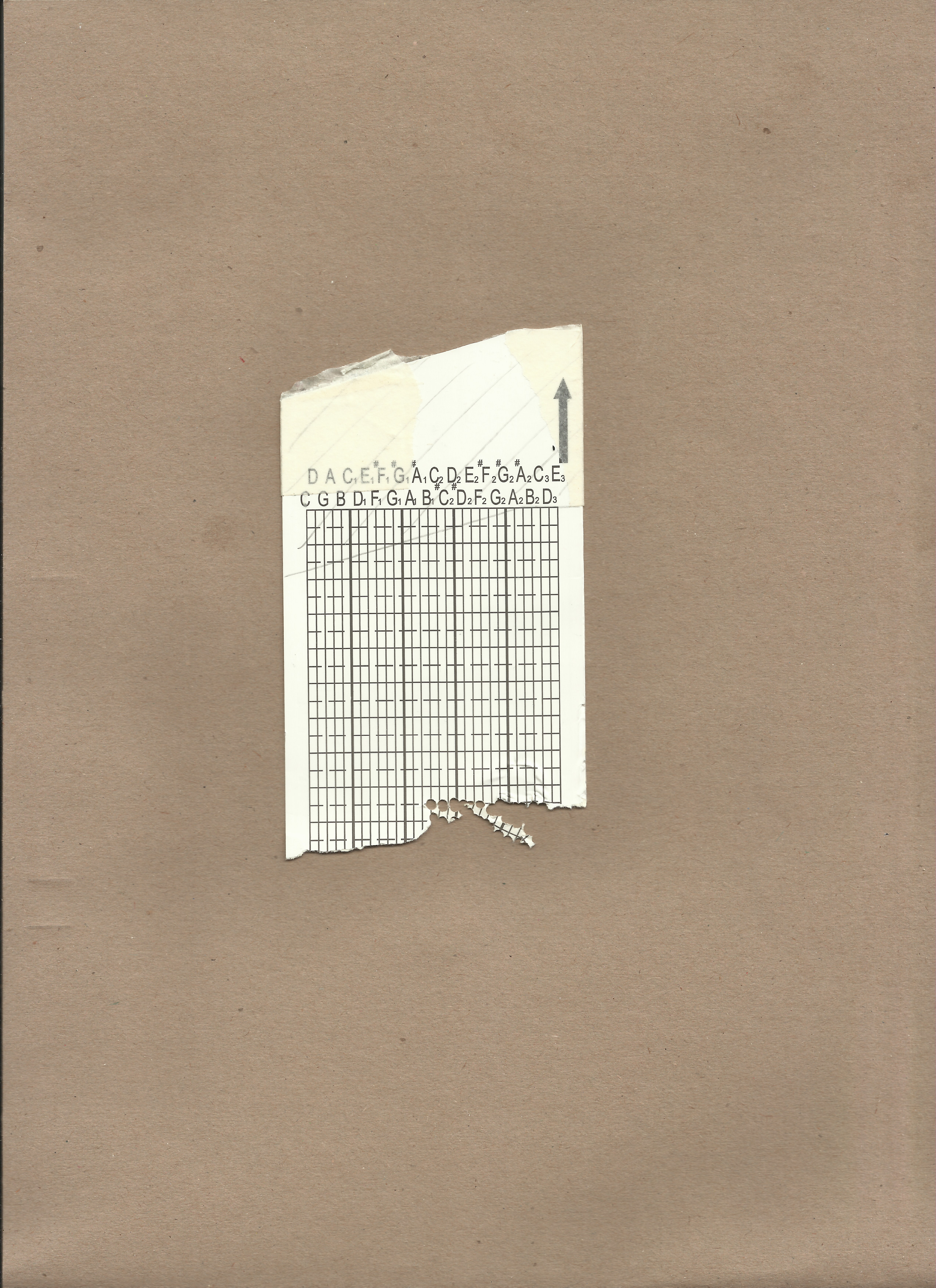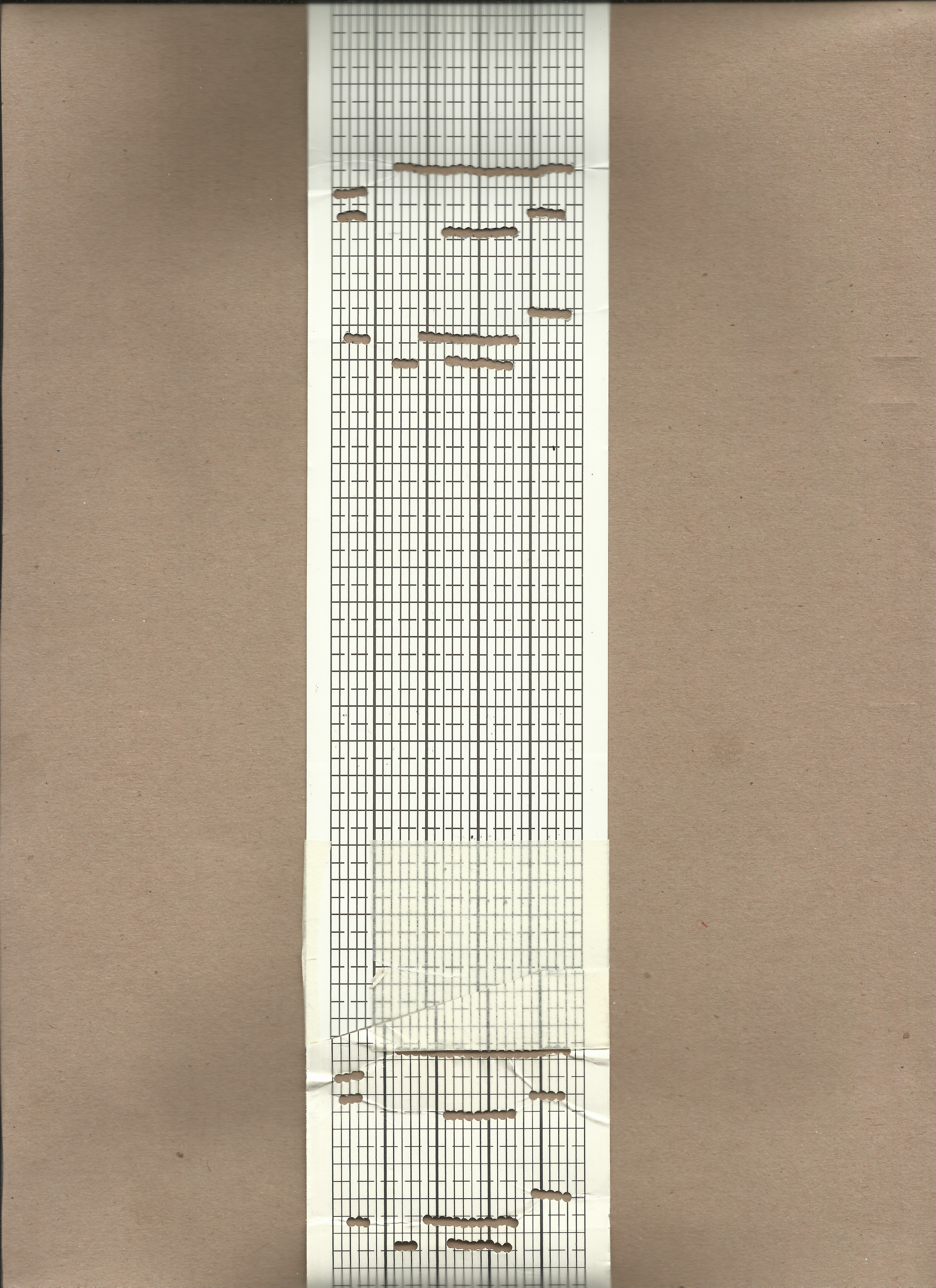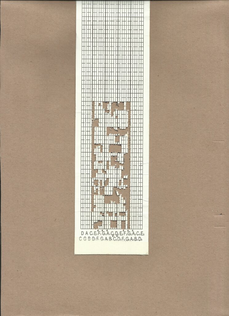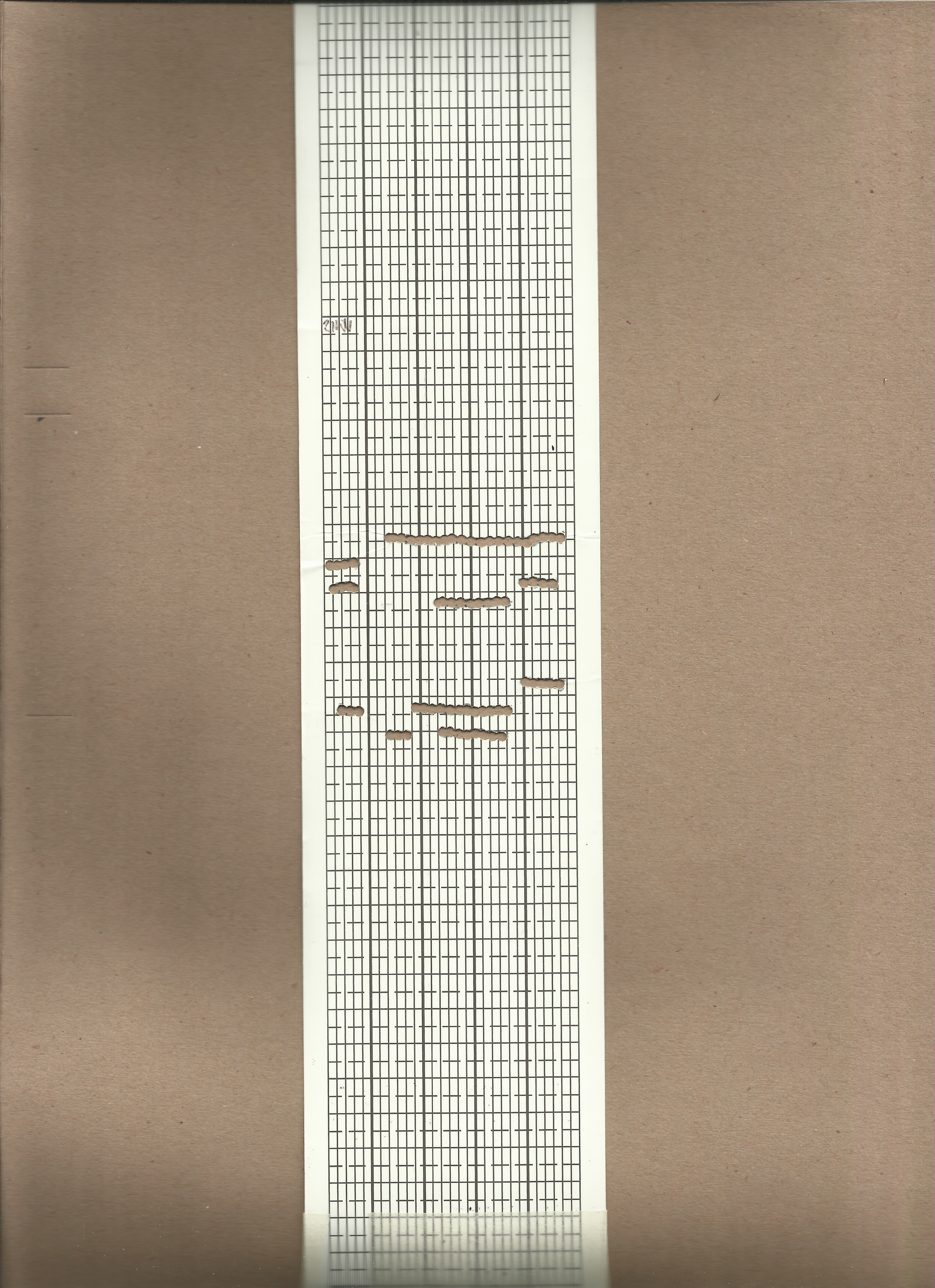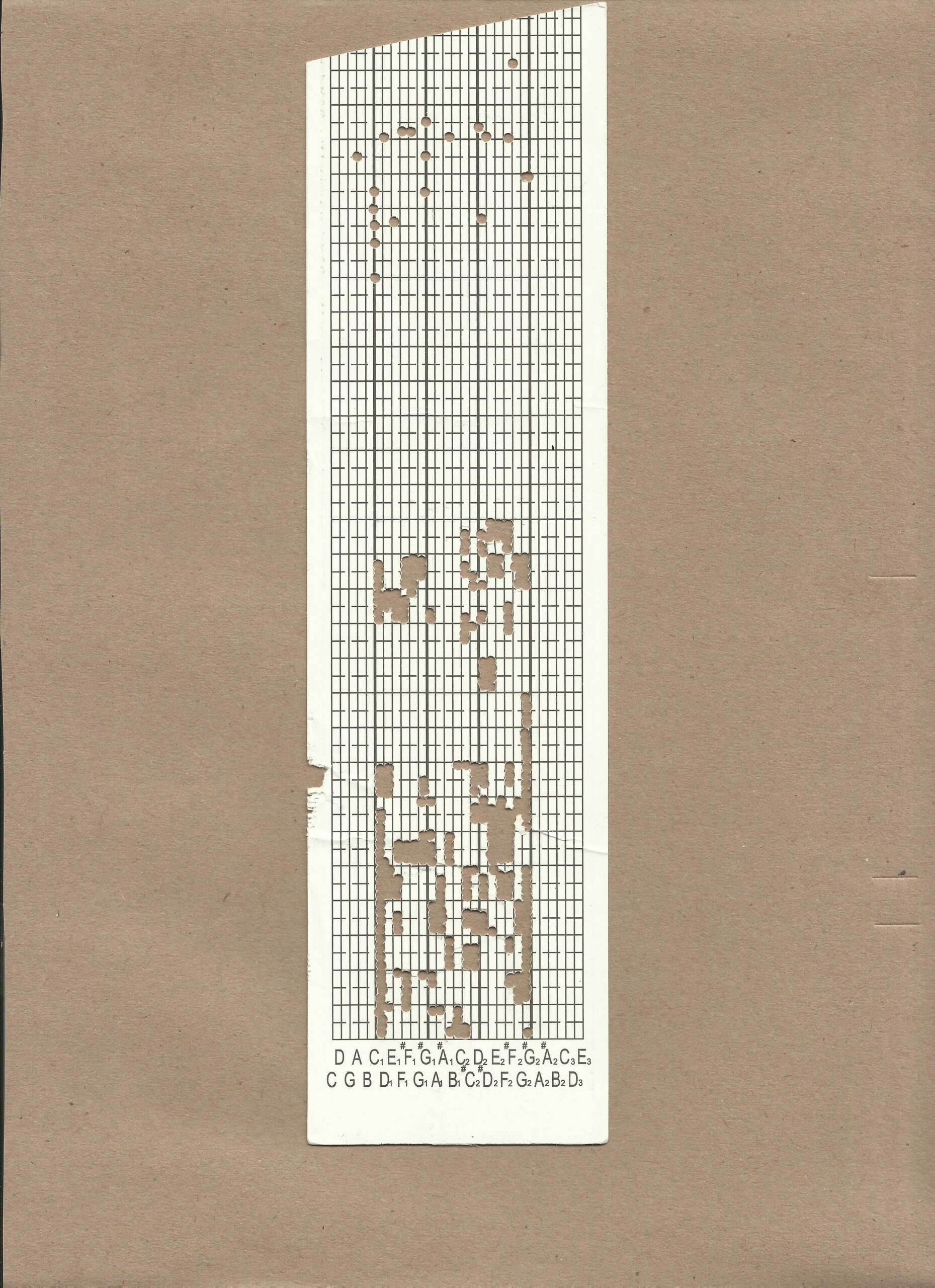 A sequence of three sound-images which together reimagines the Arts Tower as a score and composition for music box. It is a creative documentation of one of the first of a long series of transcriptions of the Arts Tower illumination into hole-punched tablature.