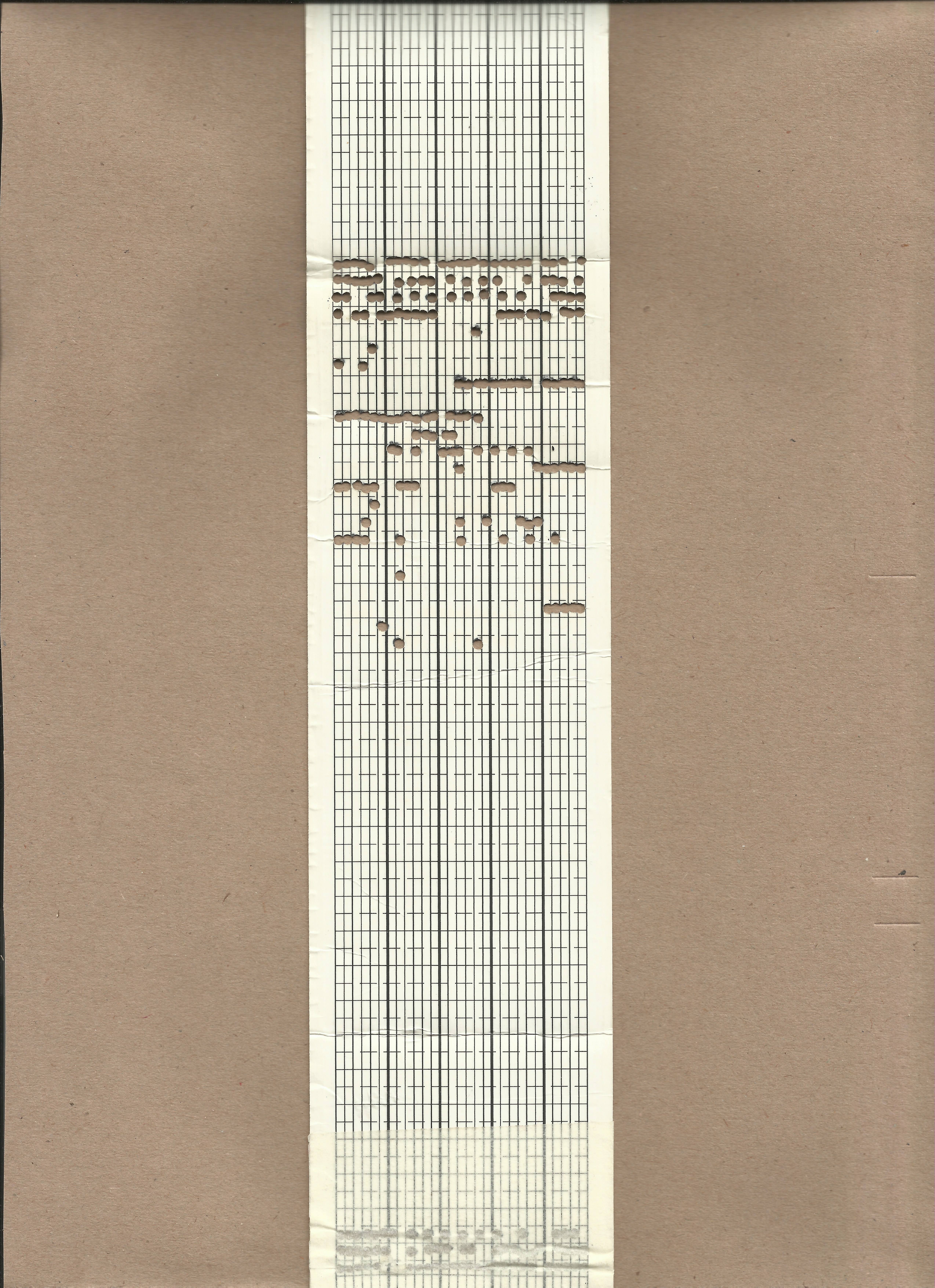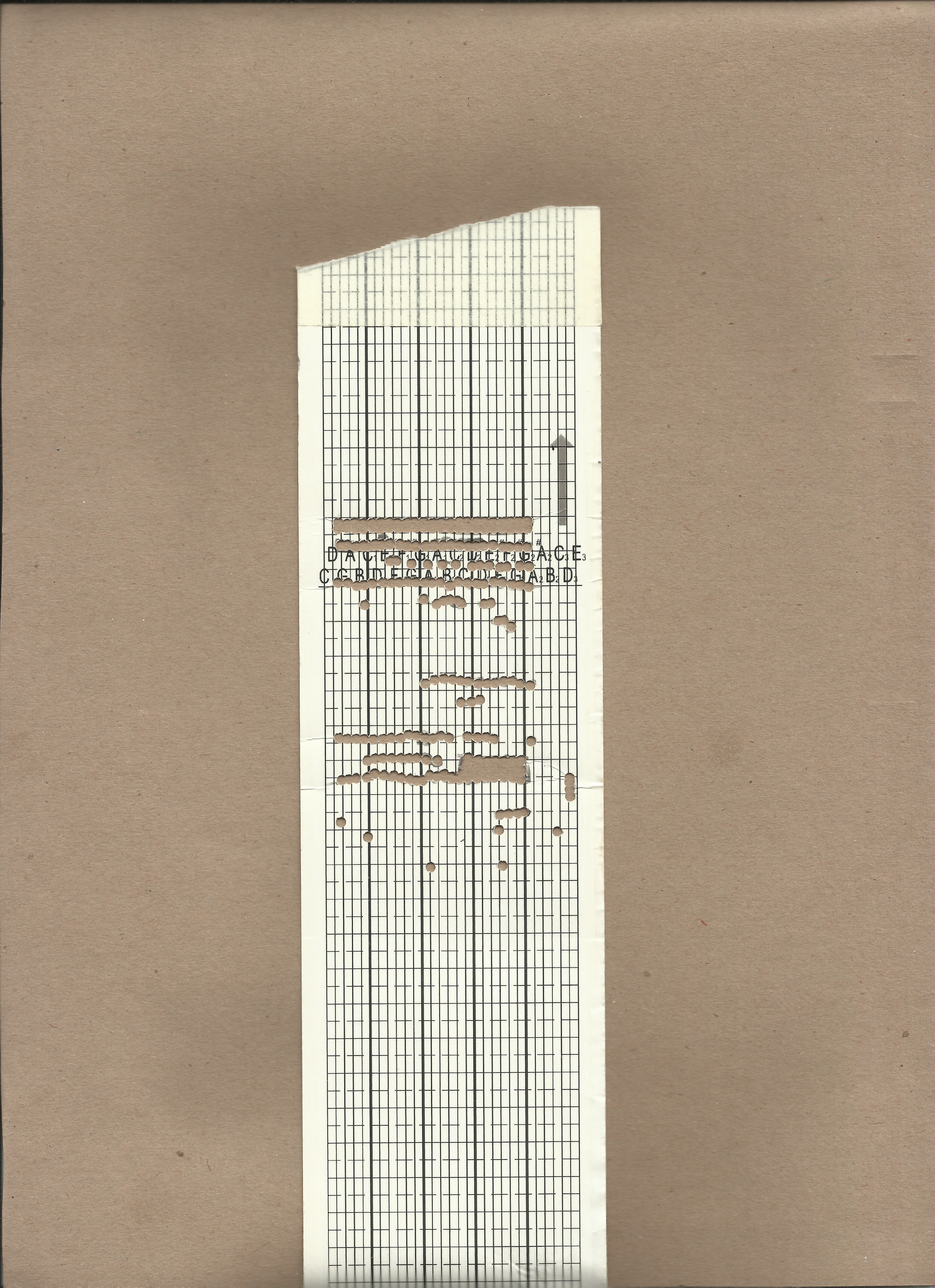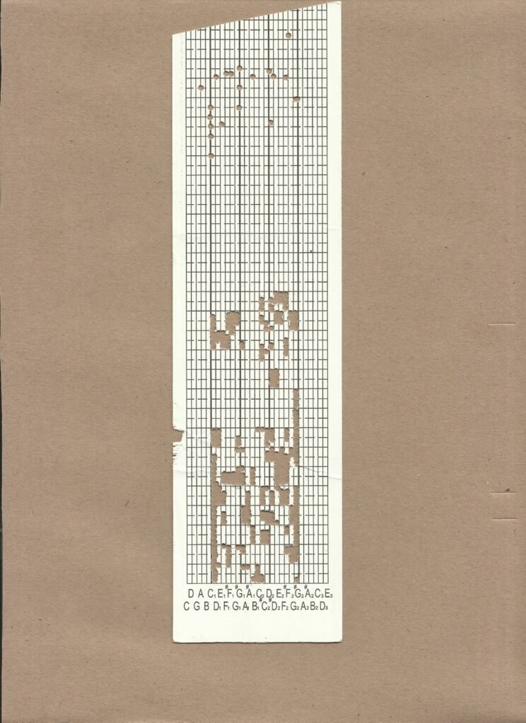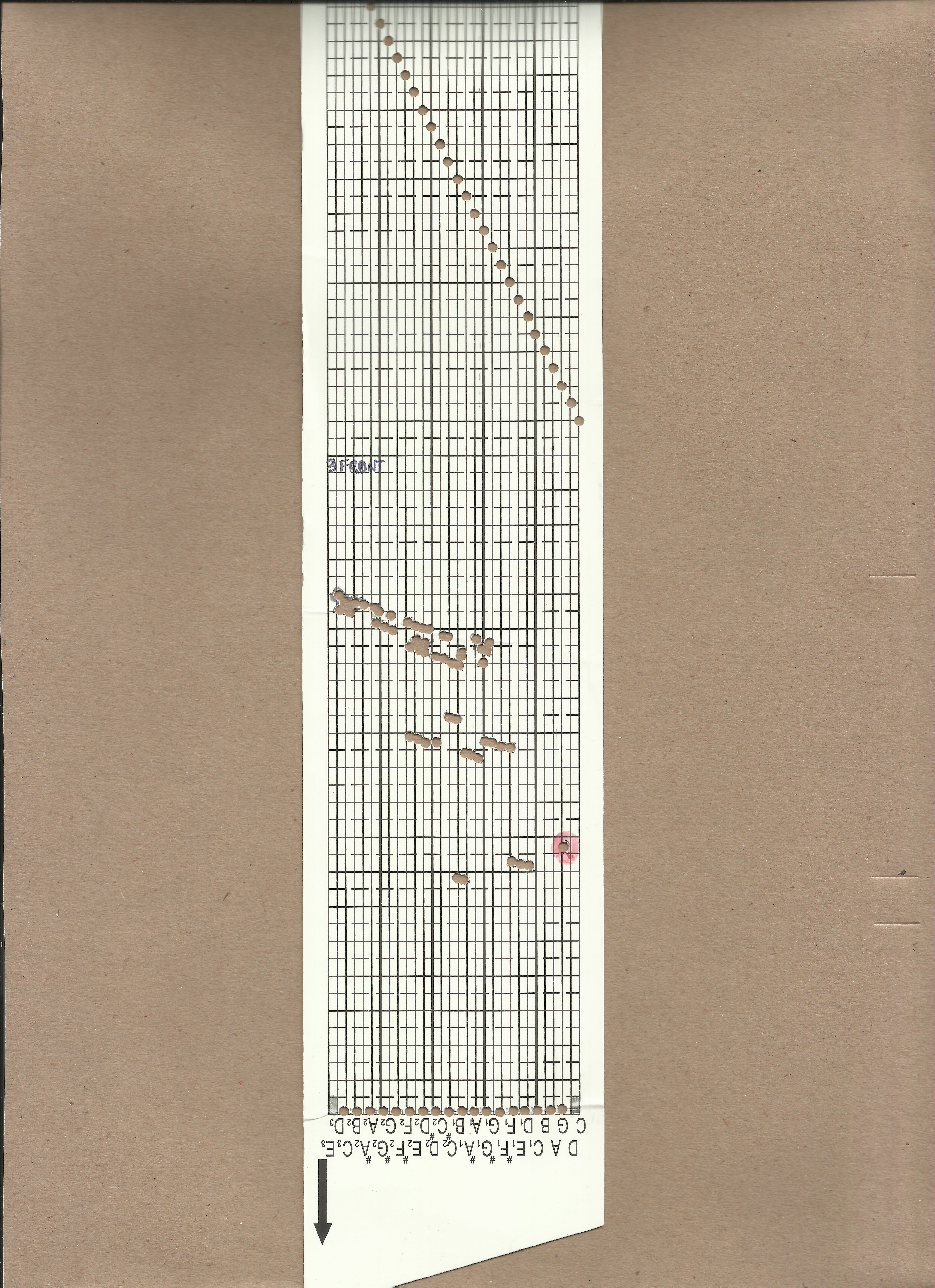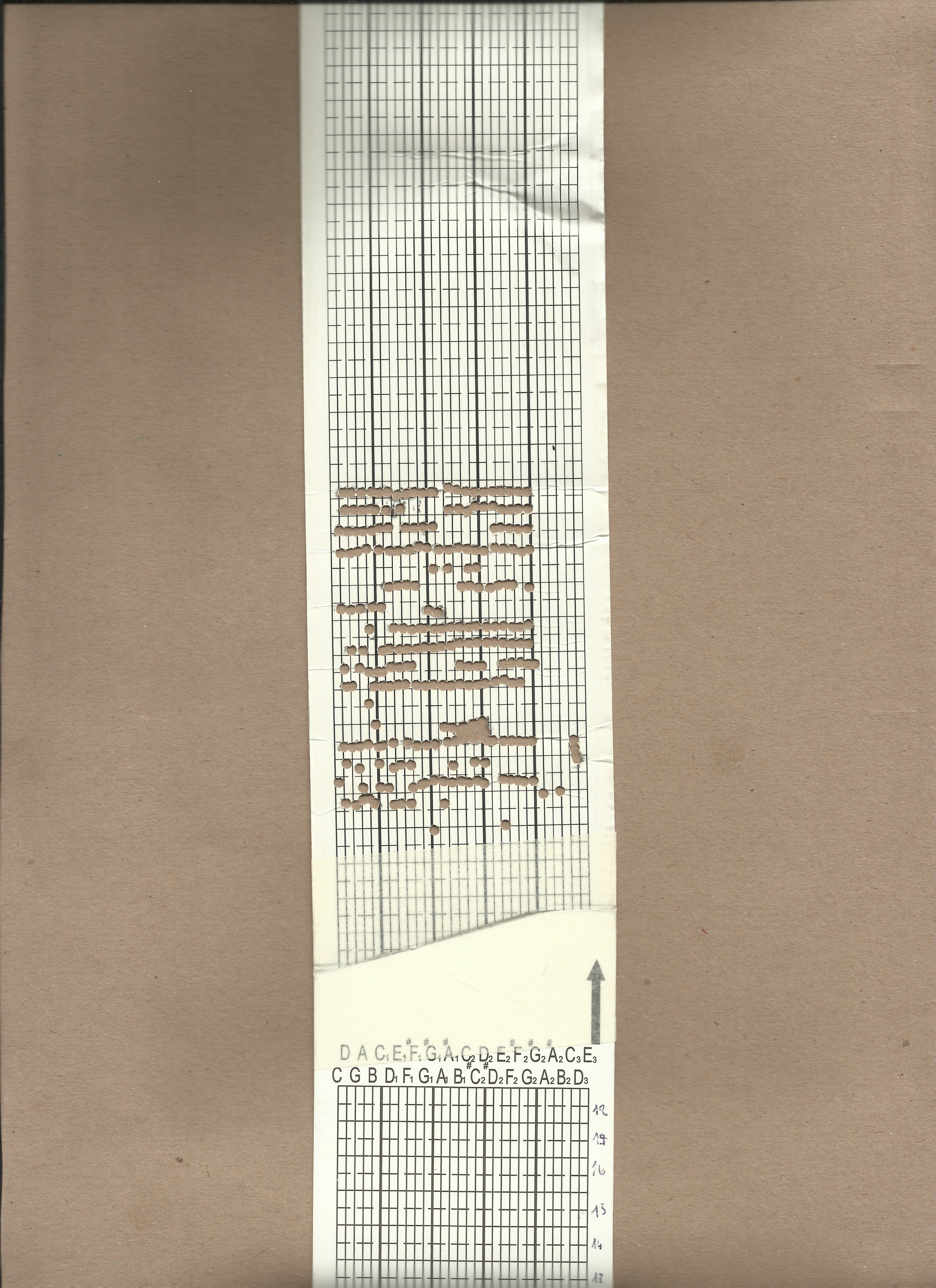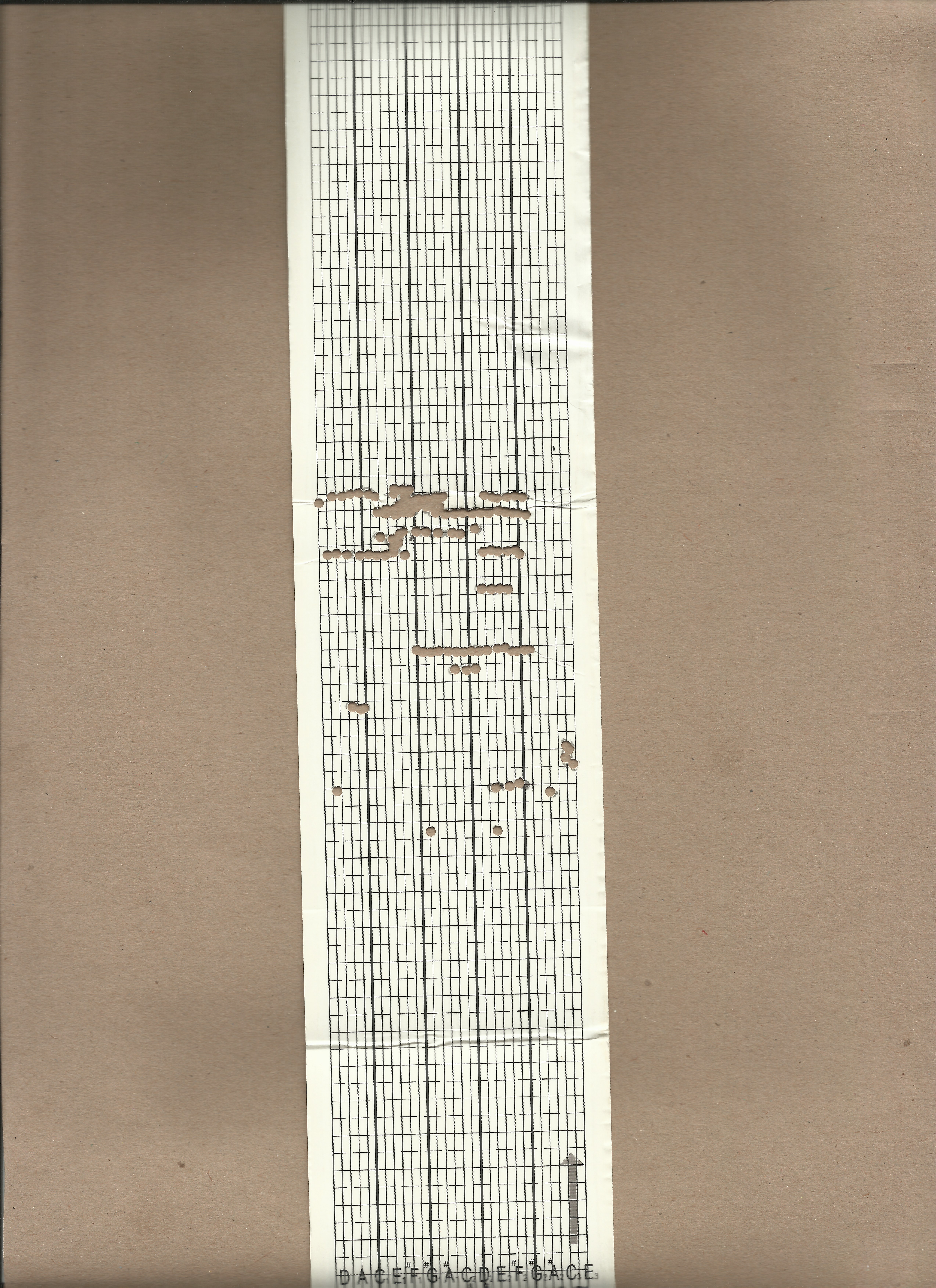 A sequence of three sound-images which together reimagines the Arts Tower as a score and composition for music box. It is a creative documentation of one of the first of a long series of transcriptions of the Arts Tower illumination into hole-punched tablature.